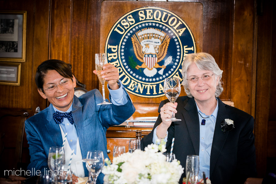 M & G had a perfect, personal and most importantly, legal wedding on the USS Sequoia on a “special” date – 11/12/13. That was a Tuesday! I was so excited for a “special date” Tuesday wedding! I know that sounds really weird, but wedding planners can be weird. I was also really excited for my first wedding on a boat since I left my job at the Spirit of Washington in 2004. The USS Sequoia typically docks in Washington DC, but since M & G’s guests were staying at the Hotel Monaco in Alexandria, we had the yacht dock in Alexandria instead. After an intimate wedding ceremony, a lunch buffet was enjoyed by all. Guests came from all over the country to celebrate with all these ladies on the Presidential Yacht USS Sequoia so there was a lot of catching up happening on the lunchtime cruise.